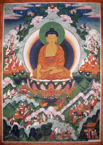 Le Bouddha Amitābha a été révélé par l’omniscience du Bouddha Shakyamuni de façon spontanée. A au moins trois reprises, sous formes de soutras, le Bouddha Shakyamuni de par son Amour et sa Compassion illimitée, a décrit précisément le Bouddha Amitābha de Lumière Infinie et sa Terre Pure de l’Ouest, qui se trouve loin de la portée de l’esprit ordinaire.